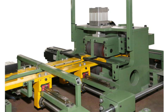 送料是本機(jī)的核心部分,它負(fù)責(zé)送料和測(cè)長(zhǎng),保證各種片型的長(zhǎng)度精度,送料機(jī)主要核心部件有送料輥、測(cè)量輥、 導(dǎo)向定位導(dǎo)軌、伺服電機(jī)、編碼器、壓輥氣缸等組成。開(kāi)卷機(jī)卷料料頭放出后,由送料機(jī)將卷料料頭送至沖剪床固定導(dǎo)軌。